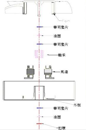 中置彈簧結(jié)構(gòu)設(shè)計較適合風(fēng)扇厚度約為25mm以上之結(jié)構(gòu),兩顆滾珠軸承設(shè)一中央扣環(huán)及一彈簧隔開,且將彈簧置放于中央扣環(huán)與后滾珠之間,藉以彈力產(chǎn)生軸承之預(yù)壓,以利滾珠與保持器能夠確切定位,不至產(chǎn)生內(nèi)滾珠與保持器之滑移產(chǎn)生機械噪音。