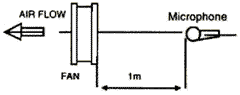 HXHT風扇的噪音是在背景噪音低于15dBA無回響室中所測量。待測風扇在自由空氣中運轉,距入風口一米處置一噪音計。